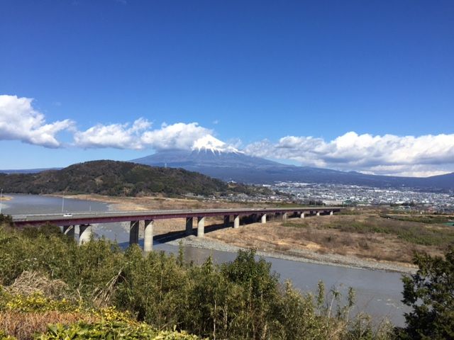 青空と白い雲、富士川と裾野の街…